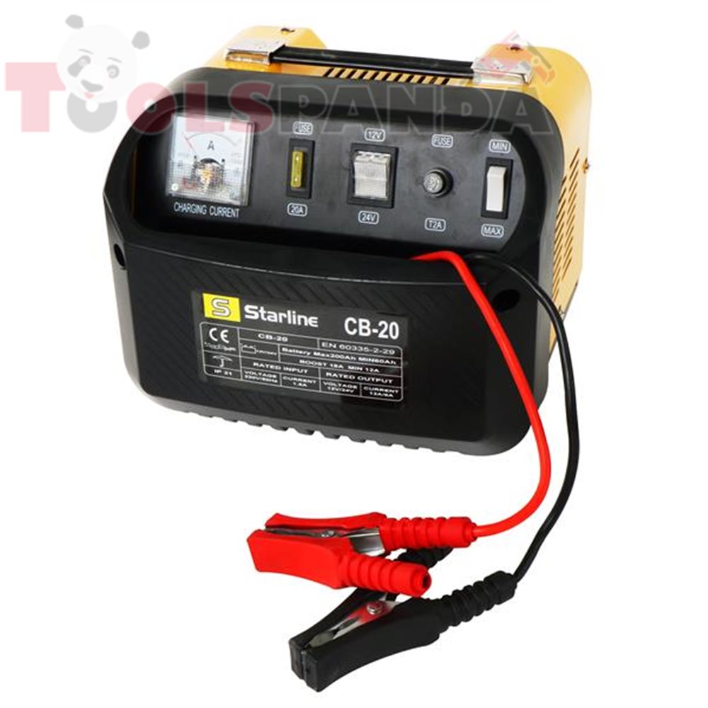 Високопроизводителен и надежден източник на зареждане за зареждане на автомобилни акумулатори 12V и 24V (60-200Ah). Защита от късо съединение и прегряване. (не е подходящ за зареждане на гел батерии) Технически параметри: Захранващо напрежение: 230 V / 50 Hz Консумирана мощност: 300W Ток на зареждане: 12 (18) / 8 (12) A Капацитет на батерията за зареждане: 60-200Ah Тегло: 6,8 кг